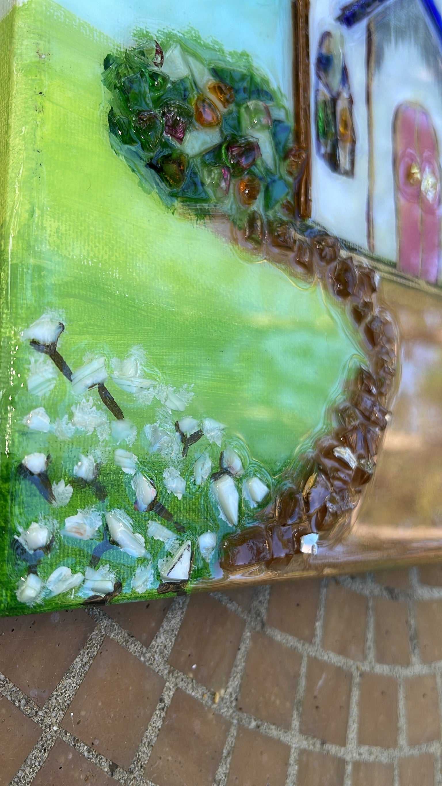 This beautiful church is hand painted with acrylics. There's a lot of hand cut glass details on this beauty. Sealed with epoxy resin.
