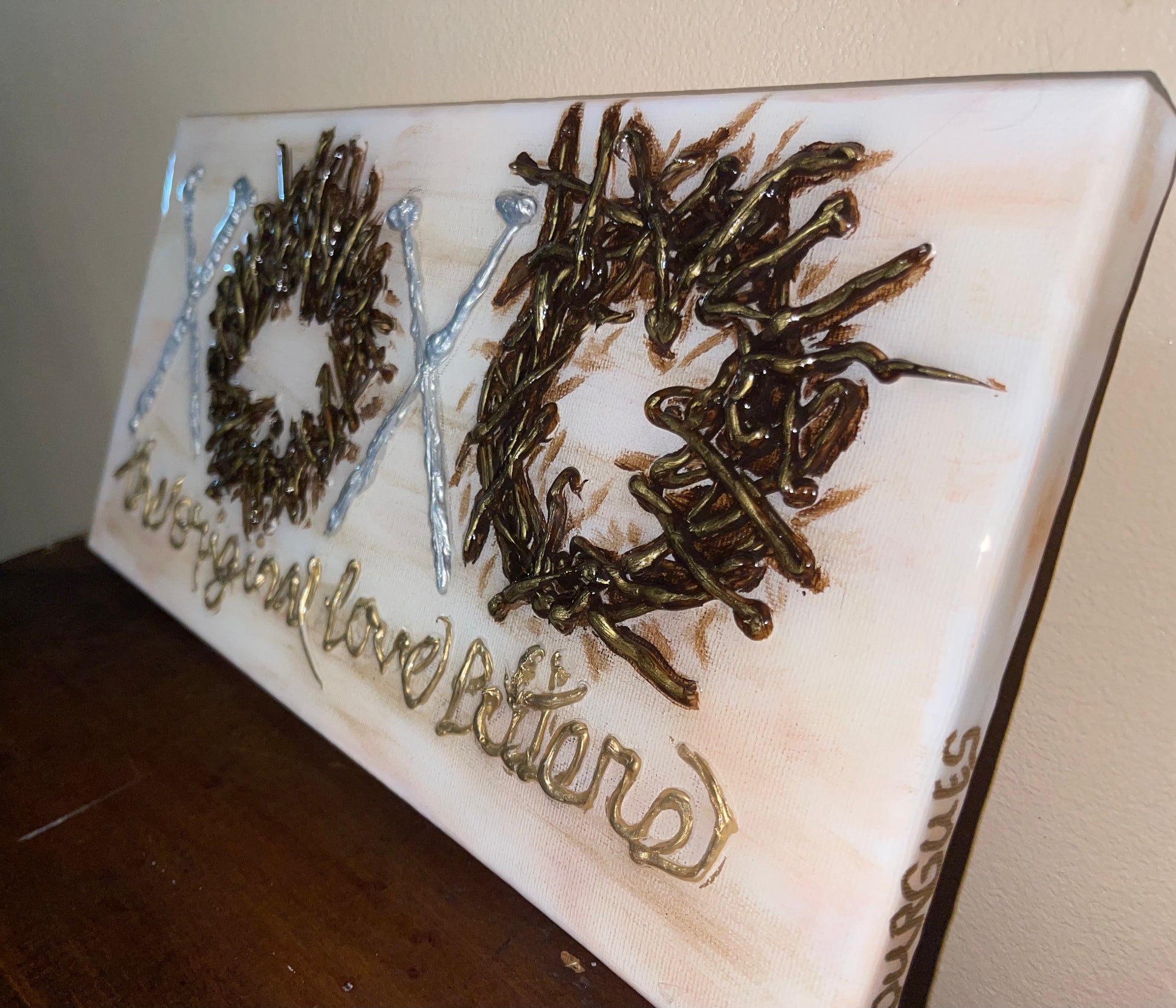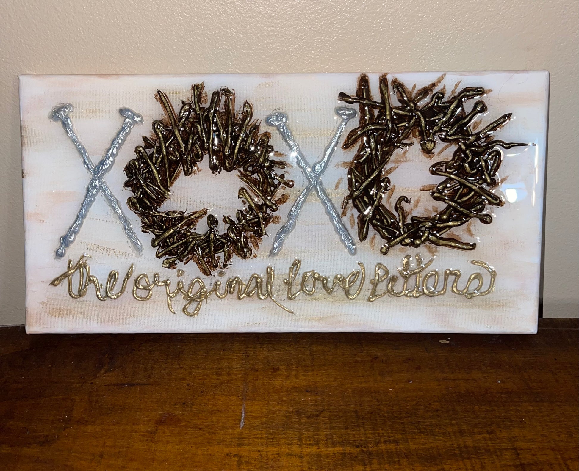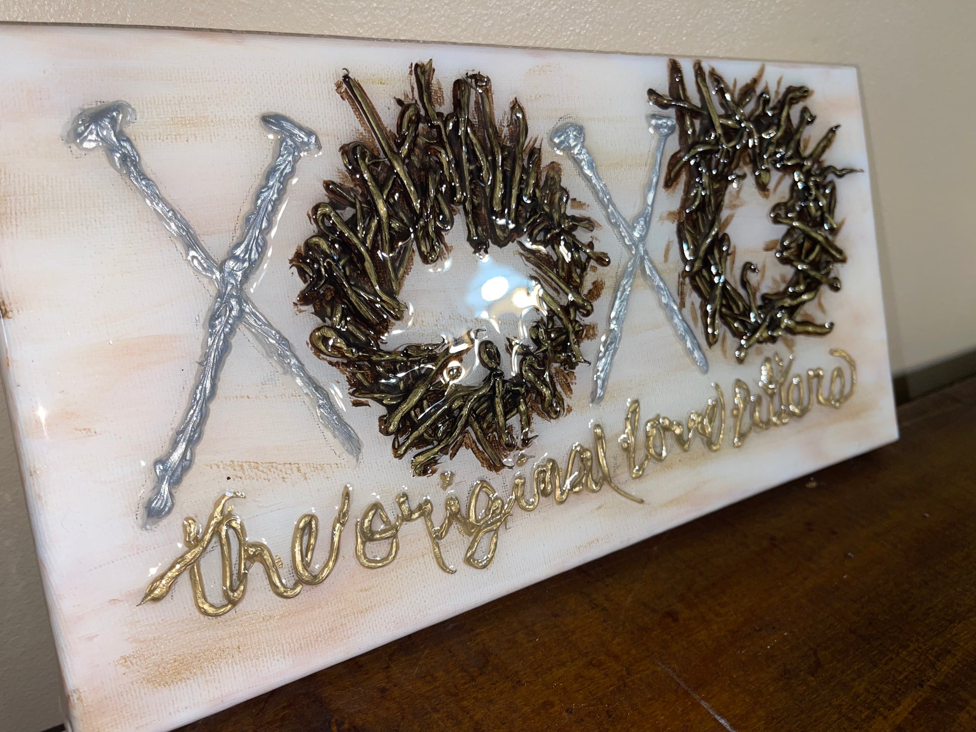 This nail & crown XOXO is made with texture paste, acrylic paint & sealed with epoxy resin. There is no glass on this piece it is only textured.