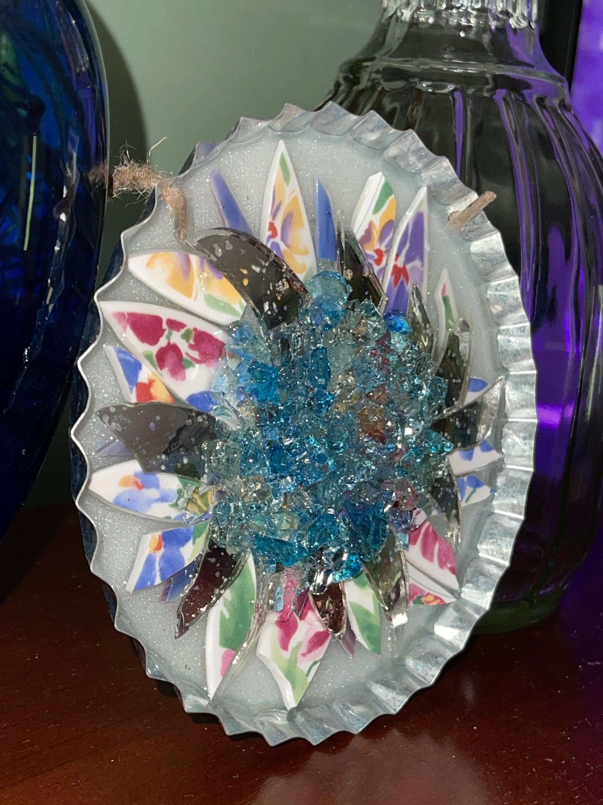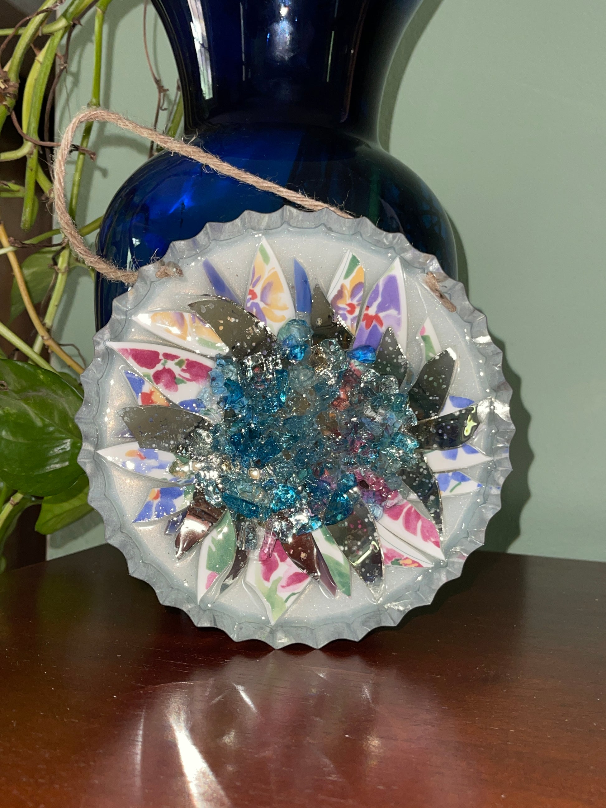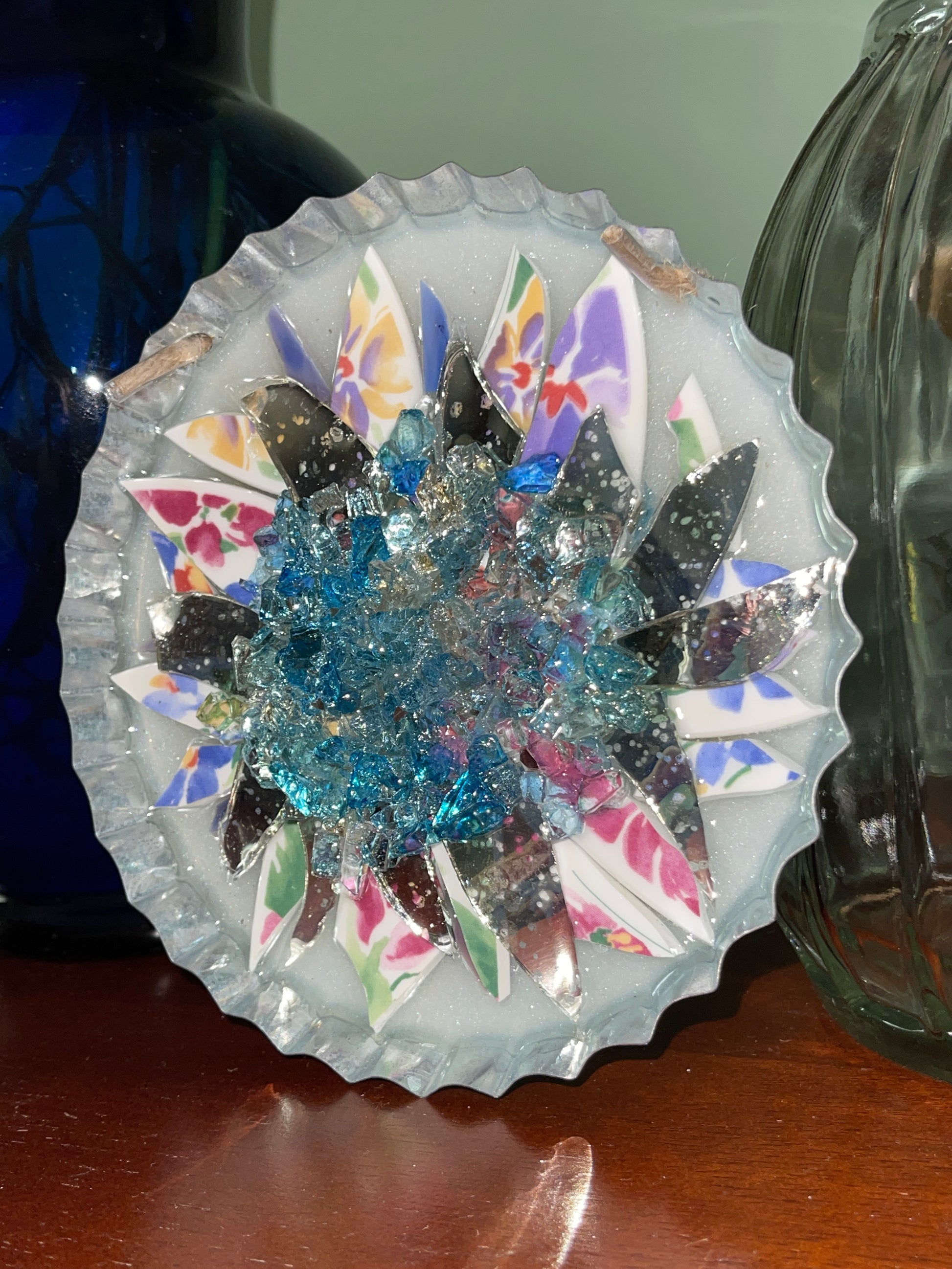 This beautiful vintage sunflower is made from vintage China & hand cut glass. It is centered inside a 6 inch round galvanized metal bottle cap and it is ready to hang for all your family and friends to admire. The entire piece is sealed with epoxy resin.