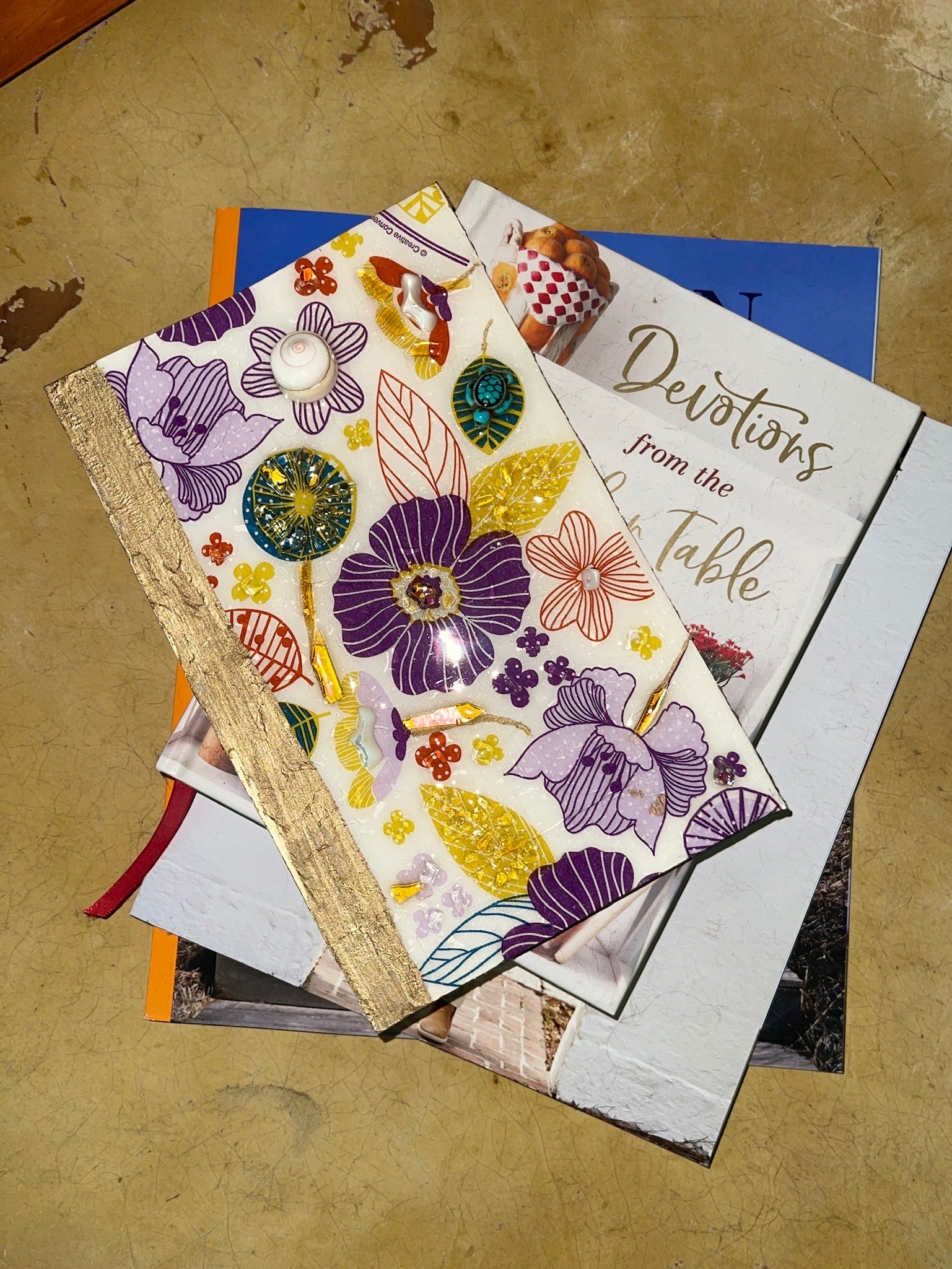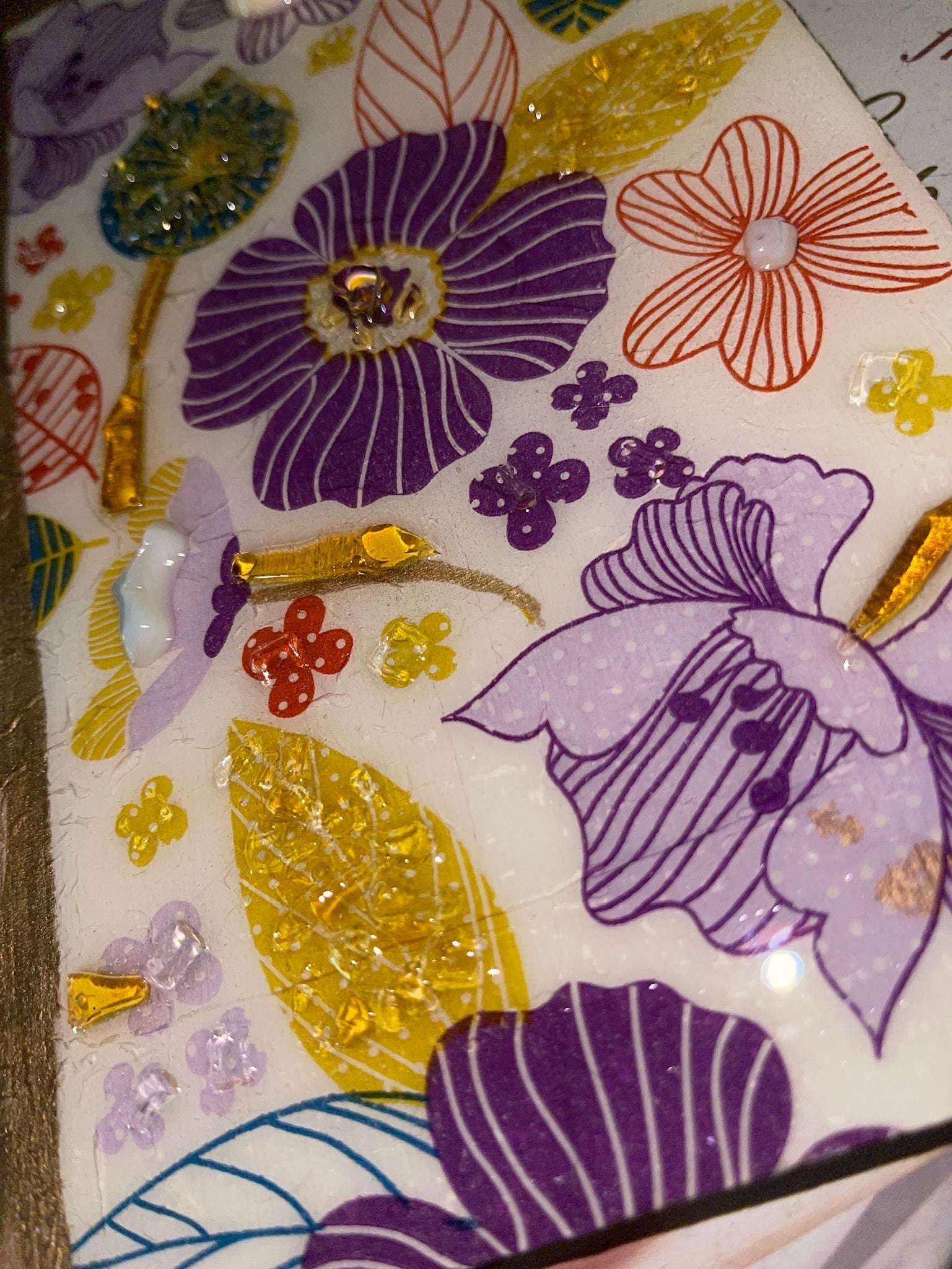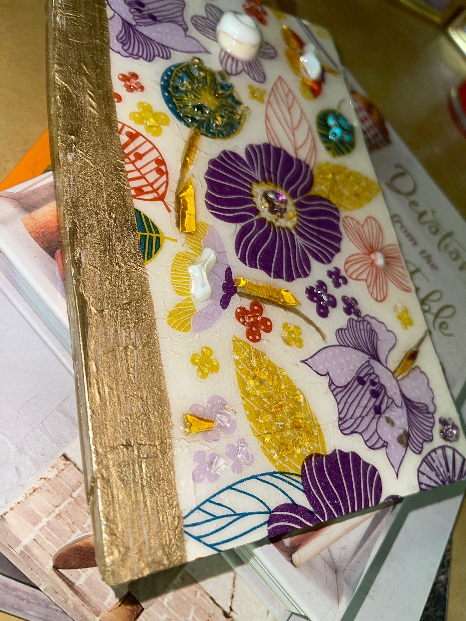 This beautiful mixed media, book cover inspired piece is a one of a kind Gourgues Creation.This decoupaged piece of wood is topped with hand cut glass pieces that have been perfectly placed and sealed with epoxy resin.