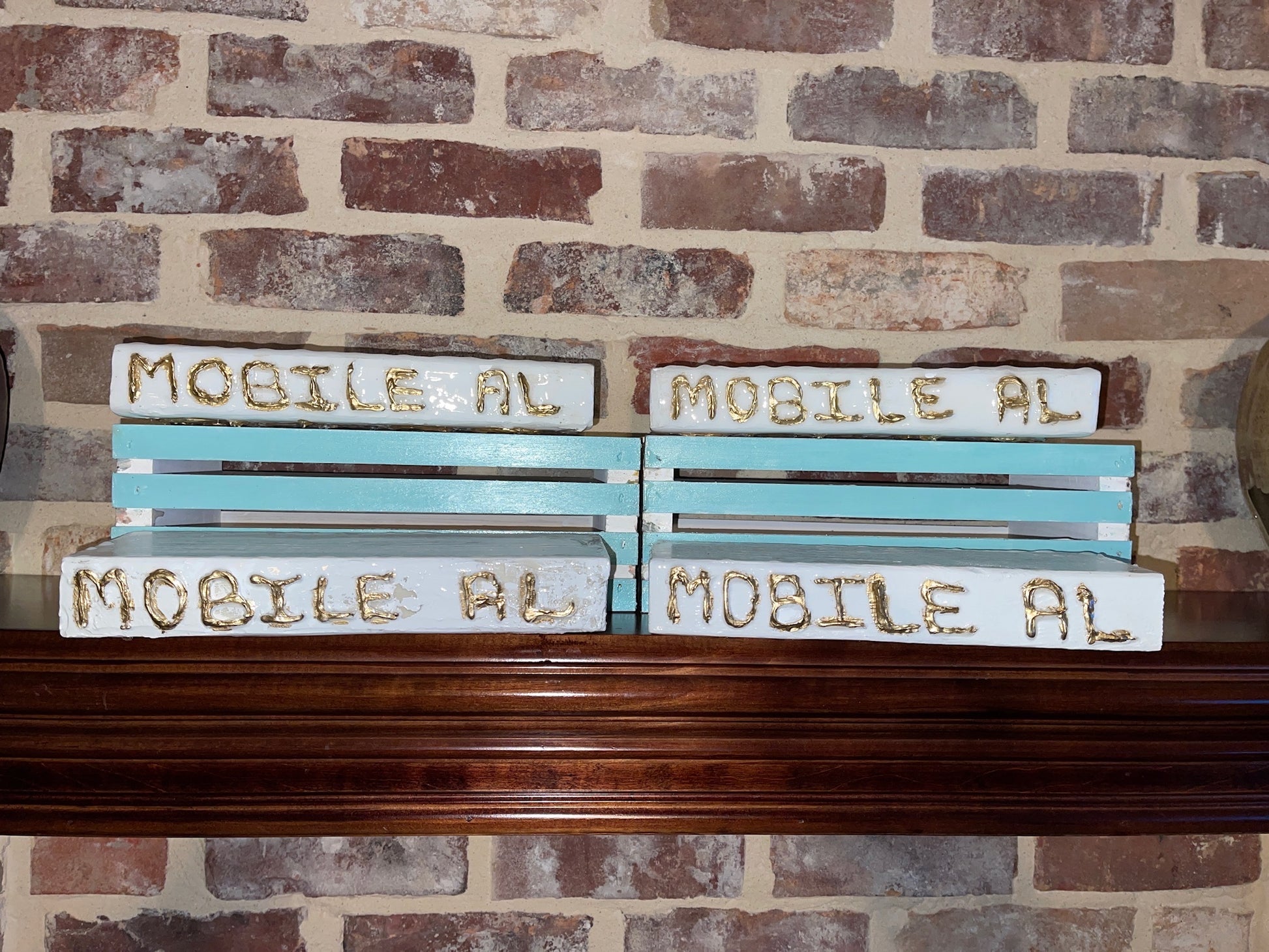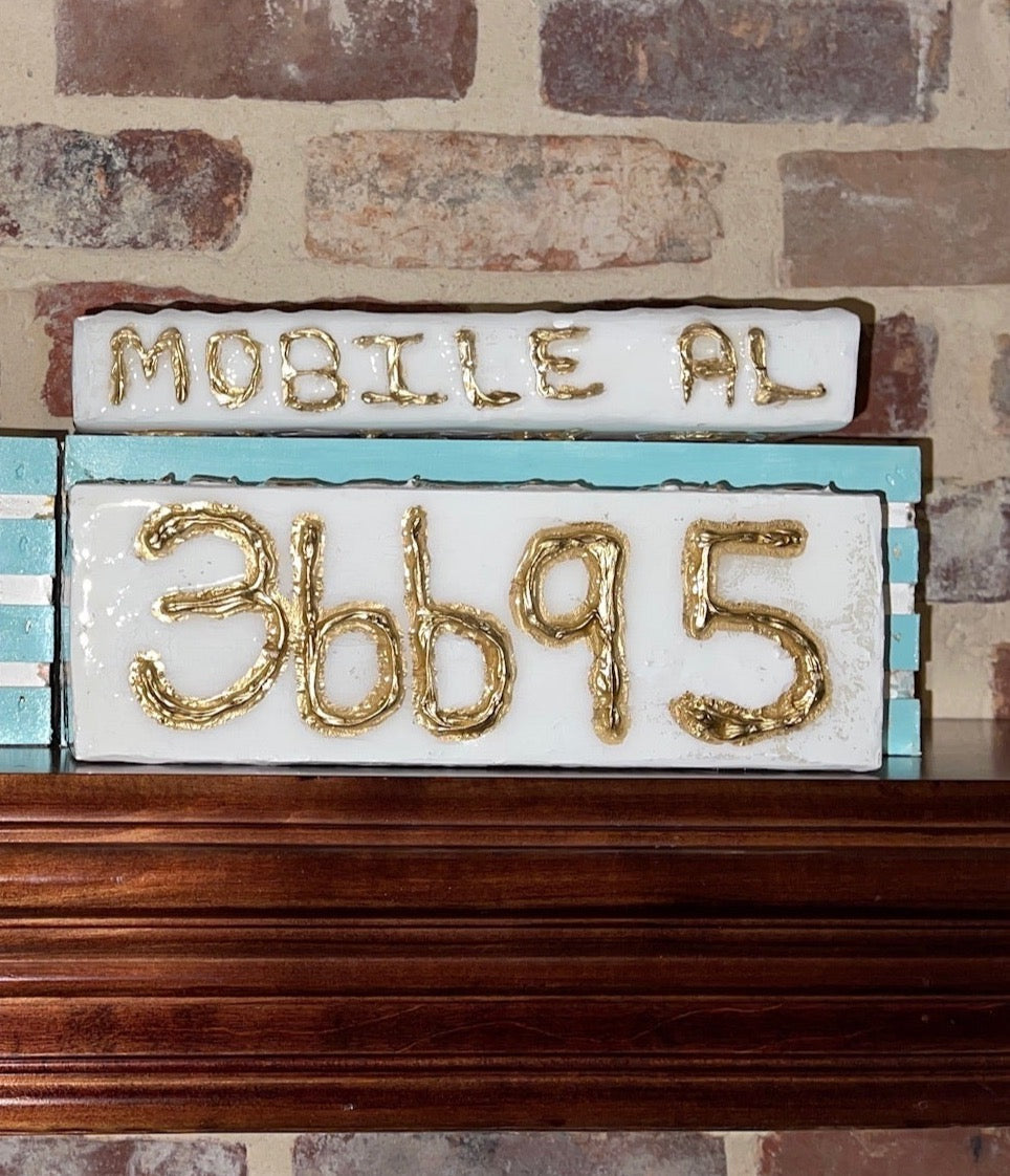 Each piece is created on a 2x4x12 inch piece of wood, painted with acrylics & the wording is made with a special molding paste. Then the entire piece is sealed with epoxy resin.